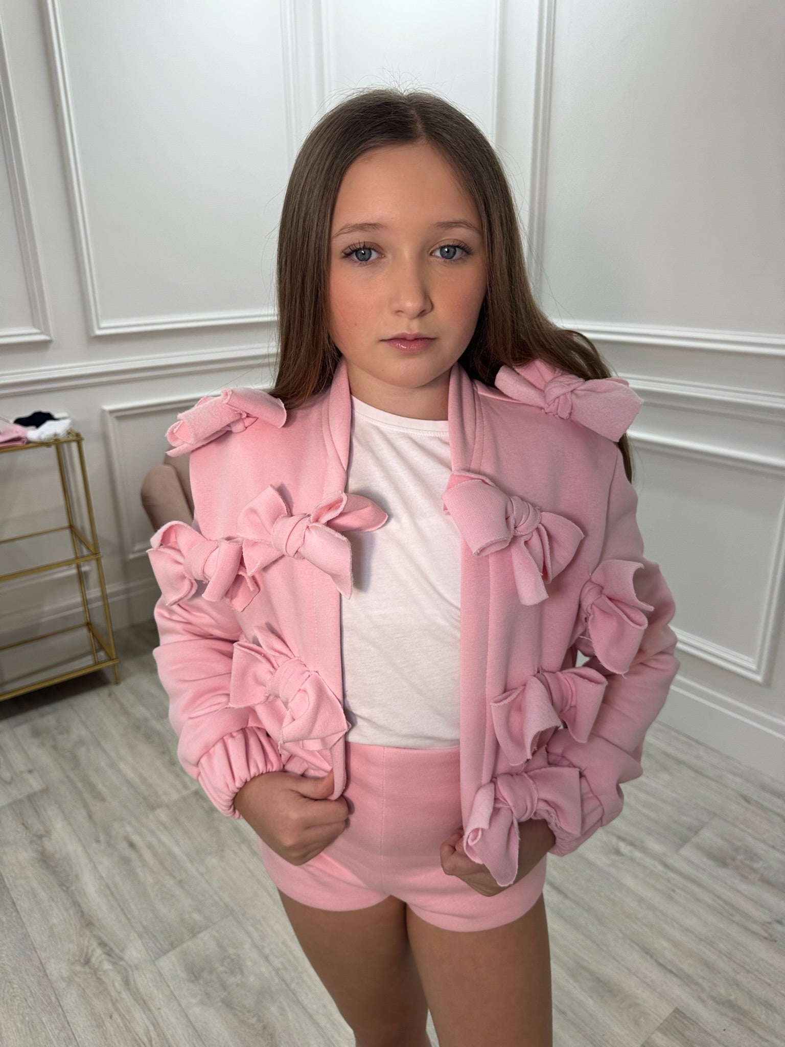 The luxury sweater fabric bomber jacket features hand-sewn bows that add a feminine, couture touch, while the tailored shorts with side zip bring a sleek, modern edge to your look. Crafted from premium sweater fabric, it's soft, cosy, and effortlessly chic — ideal for special occasions or when you want to feel like the main character.