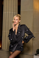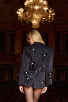 The GRACE blazer features structured shoulders that create a powerful, sculpted shape while maintaining an effortless drape. Mirroring the artistry of our SUKI dress, GRACE is adorned with gorgeous hand-applied bows, each embellished with an oversized pearl, meticulously placed across the blazer for a striking, three-dimensional couture finish.