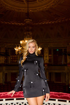 SUKI features structured shoulders that create a bold, defined form, flowing into slim, fitted sleeves that elegantly flare over the hands with a chic split detail. The mini hemline is reinforced with a subtle stiffener, giving the dress its signature hourglass shape and beautifully contoured volume.