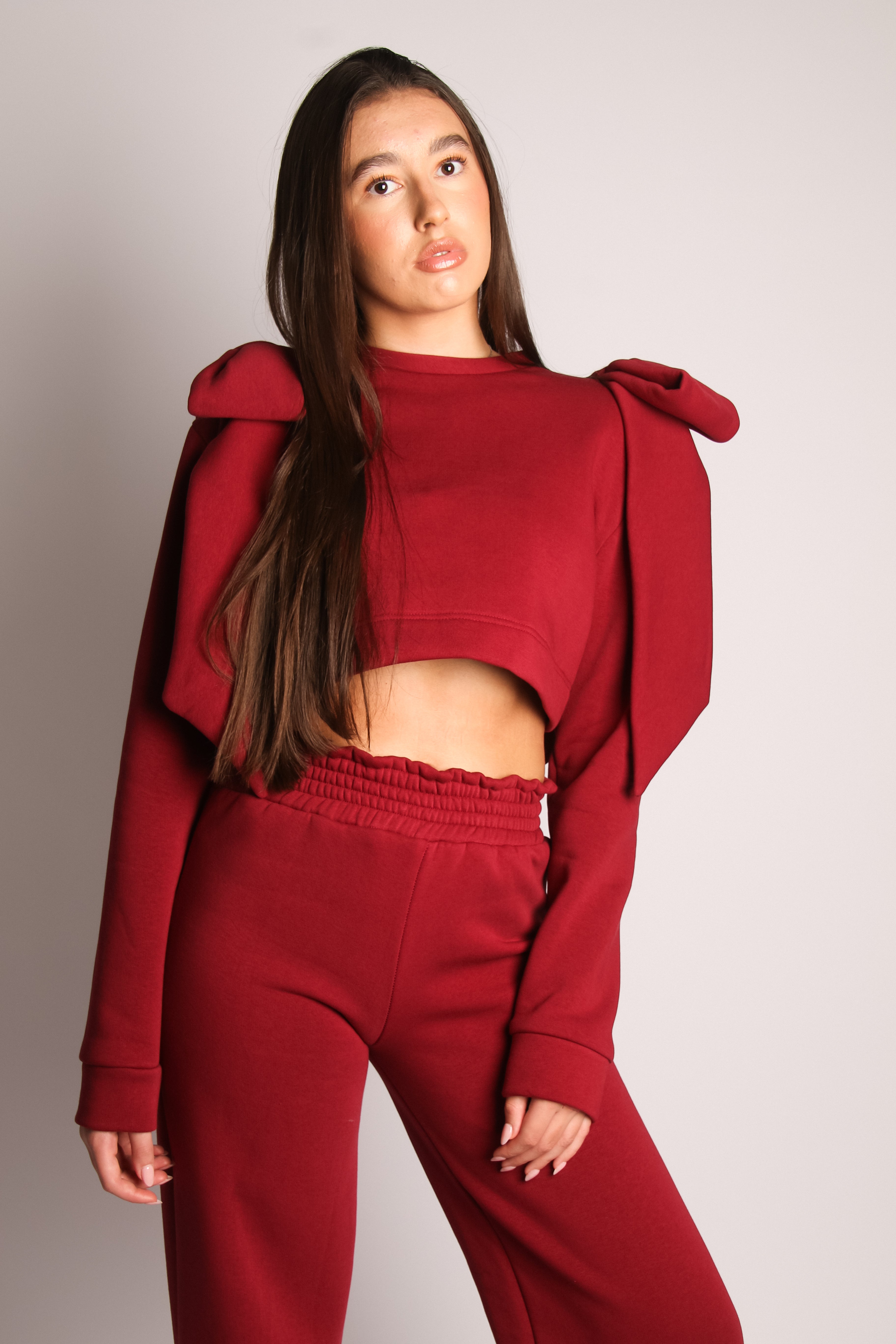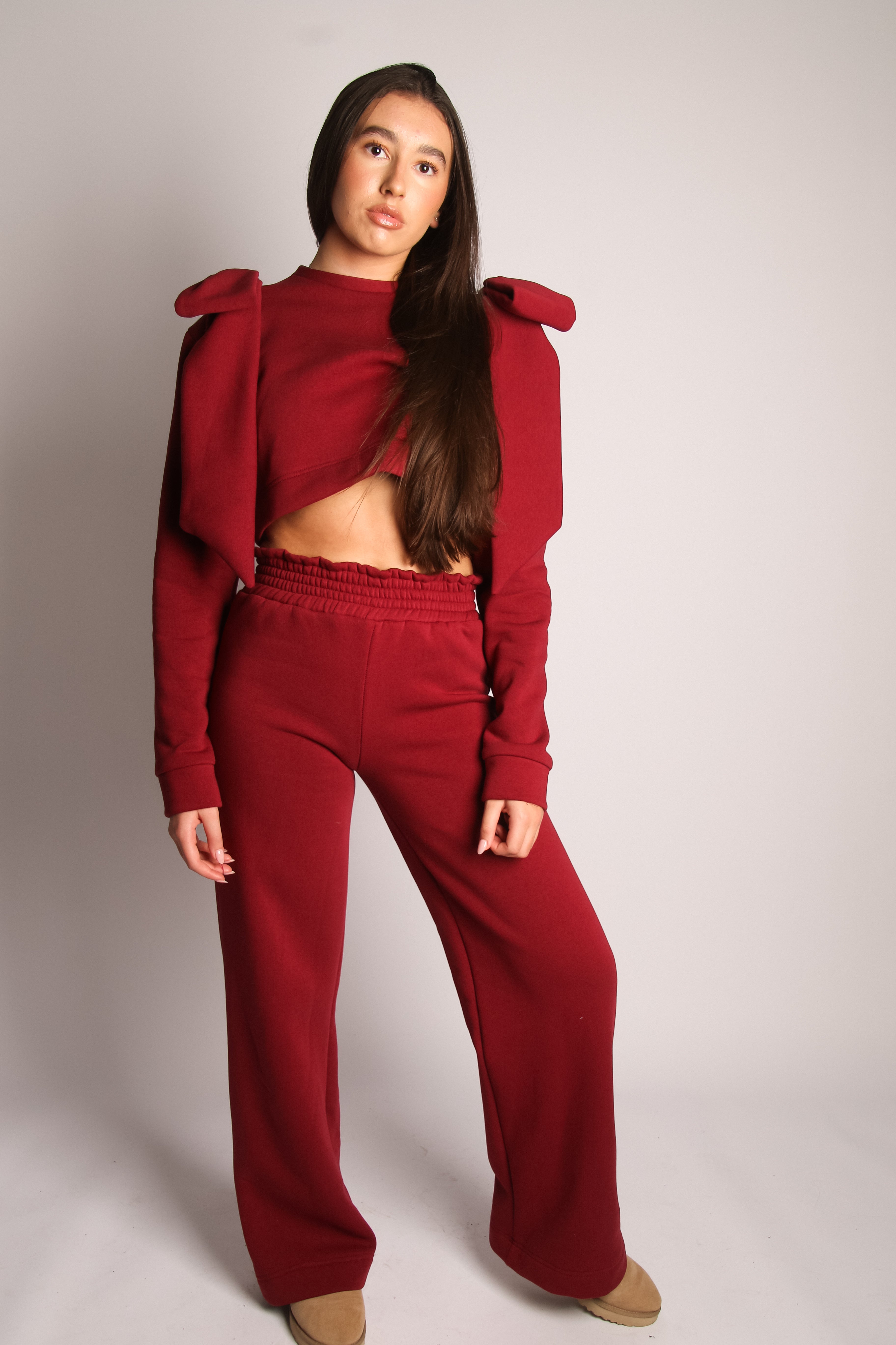 The cropped jumper features charming bow details on the sleeves, while the long straight trousers with an elasticated waistband keep the look relaxed yet polished. Crafted from soft, sweater-style fabric, it's as comfy as it is chic — ideal for everyday wear or dressier days out.