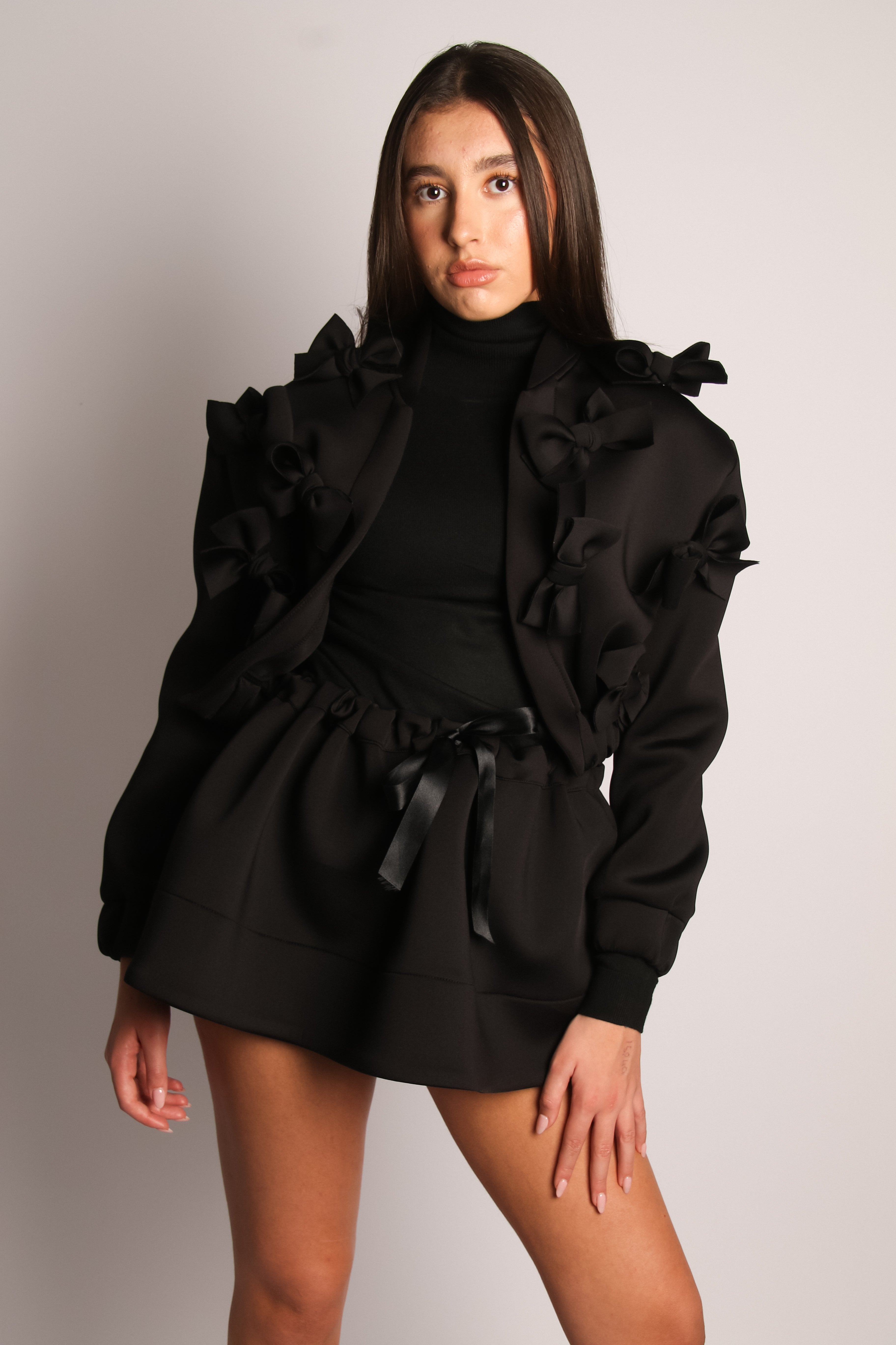 The scuba fabric bomber jacket features hand-sewn bows that add a feminine, couture touch, while the voluminous mini skirt brings drama and movement to your look. Crafted from premium scuba fabric, it's structured yet comfortable — ideal for special occasions or when you want to feel like the main character.