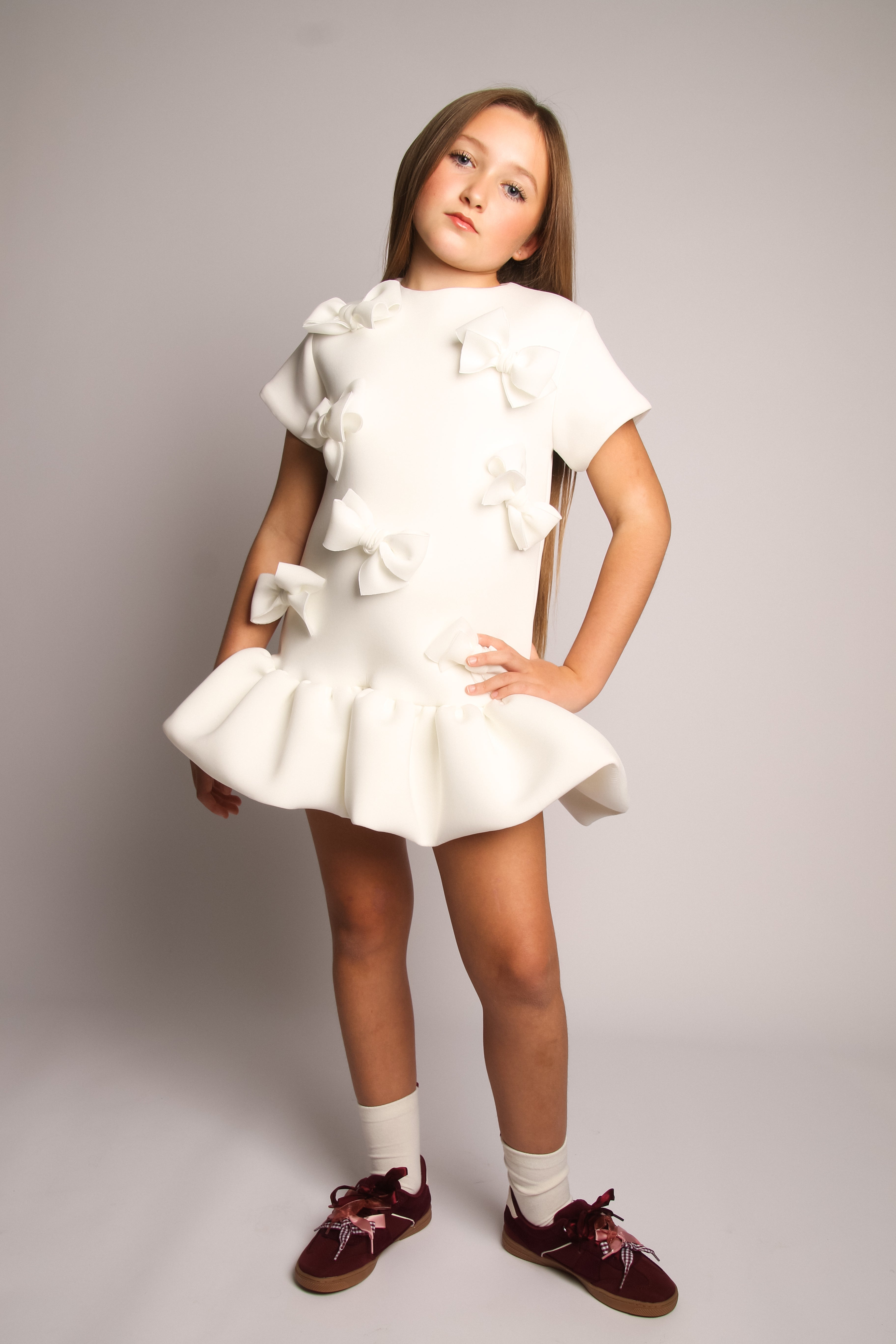 Crafted from premium ivory scuba fabric, the PETRA Dress features exquisite hand-sewn bows that add a feminine, luxurious touch, while the statement puff-ball hem creates a playful yet sophisticated silhouette. The structured scuba fabric holds its shape beautifully, ensuring you look polished and picture-perfect all day long.